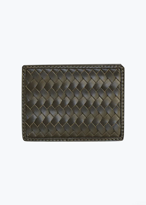 A slim, minimalist card case to hold your essentials. Made in handwoven leather and features two card slots and a pocket for loose bills.
