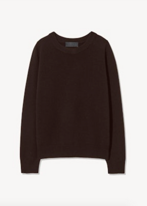 Light to medium weight sweater in cashmere. Straight body. Set in sleeve. Double layer rib at neckline. Fully fashioned along arm hole and shoulder. Wristlet sleeve length. Signature center back cable knit detail.