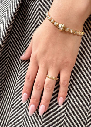 The Obo Bracelet with Round Brilliant Diamonds brings together rhythm, light, and refinement. Each gold link features a bezel-set Diamond, forming a continuous pattern of brilliance that circles the wrist like a halo.