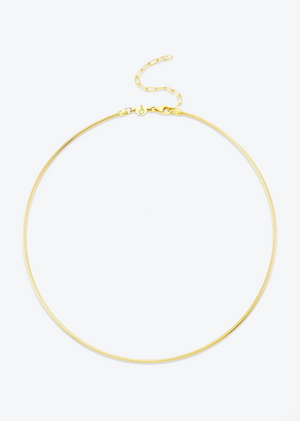 A minimalist staple with a modern edge. This sculptural wire omega chain is crafted in solid yellow gold, designed to carry pendants or wear solo, and finished with an adjustable two inch extender.