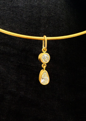 A statement, but not in the obvious way. This one-of-a-kind diamond Darius pendant plays with balance and contrast, featuring two bezel set diamonds—one Old Mine Cut, and one pear shape—each stone softly faceted to glow rather than sparkle, giving them a depth that feels almost ancient.