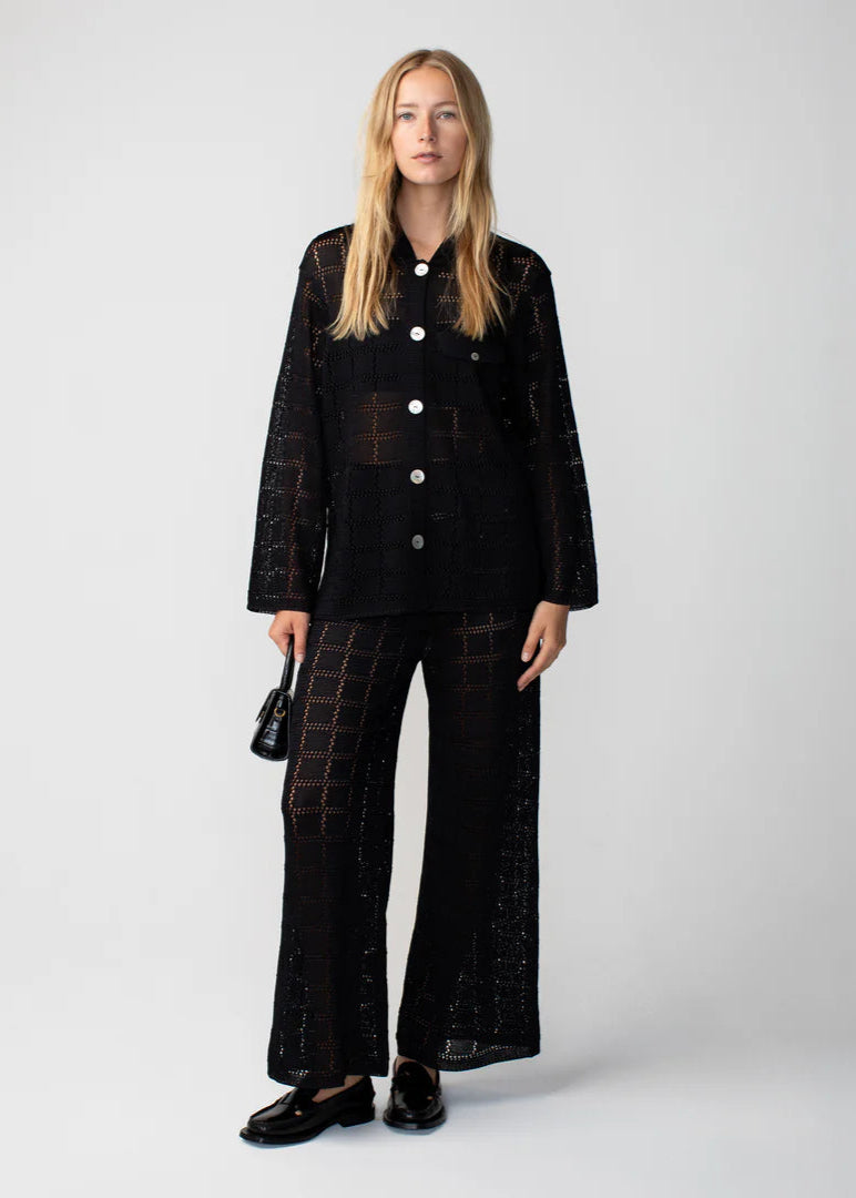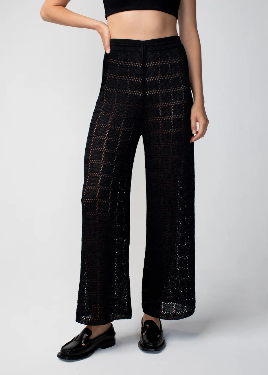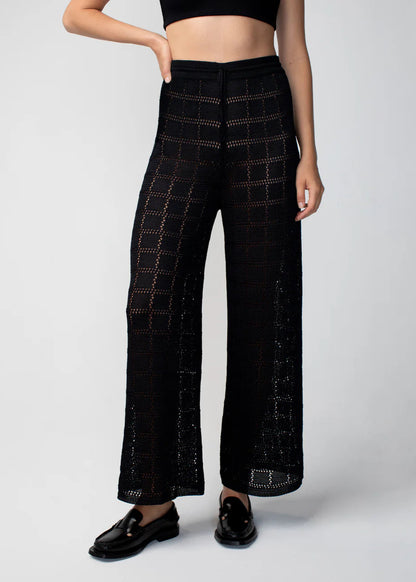 The ultimate feel-good pants. These wide leg patchwork pants are the definition of laid-back luxury. Their subtle checkered pattern is knitted in Calle del Mar's signature viscose yarn.