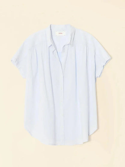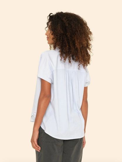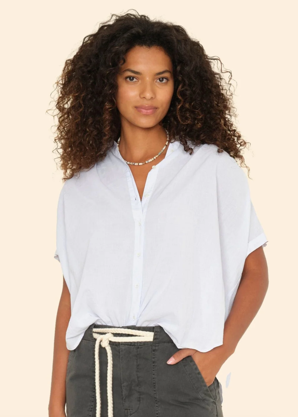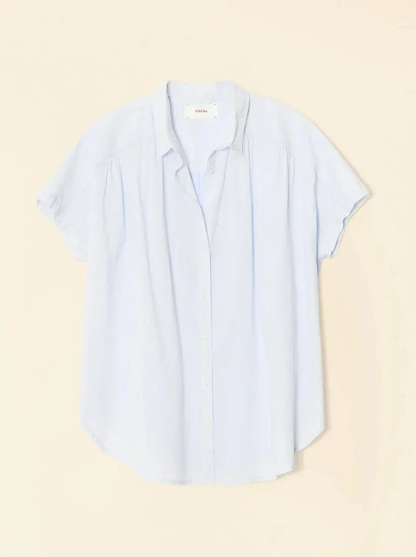 Pax is new this season in Xirena's classic lightweight woven cotton poplin with a contrast baby jersey back for an elevated feel. This short sleeve mixed media shirt features a button-front, cap sleeves, shirred shoulder and back yokes, and a high low shirttail hem.