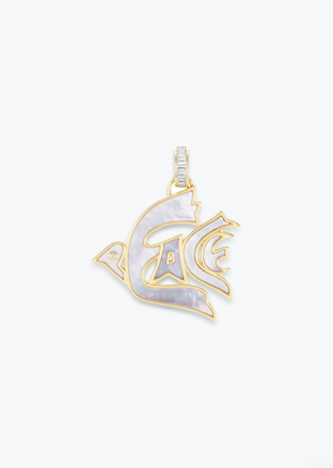 Handcrafted 18k yellow gold pendant with carved mother of pearl inlay and diamonds.