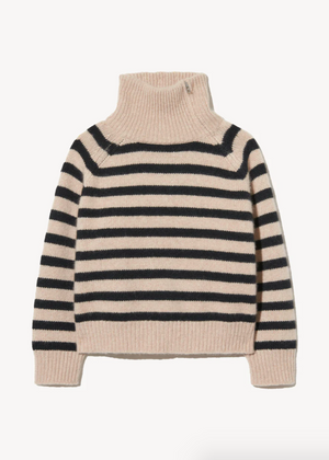 Boxy fit chunky weight turtleneck sweater in airspun cashmere, designed with raglan sleeves and featuring a side zip up neck. Signature center back cable knit detail.