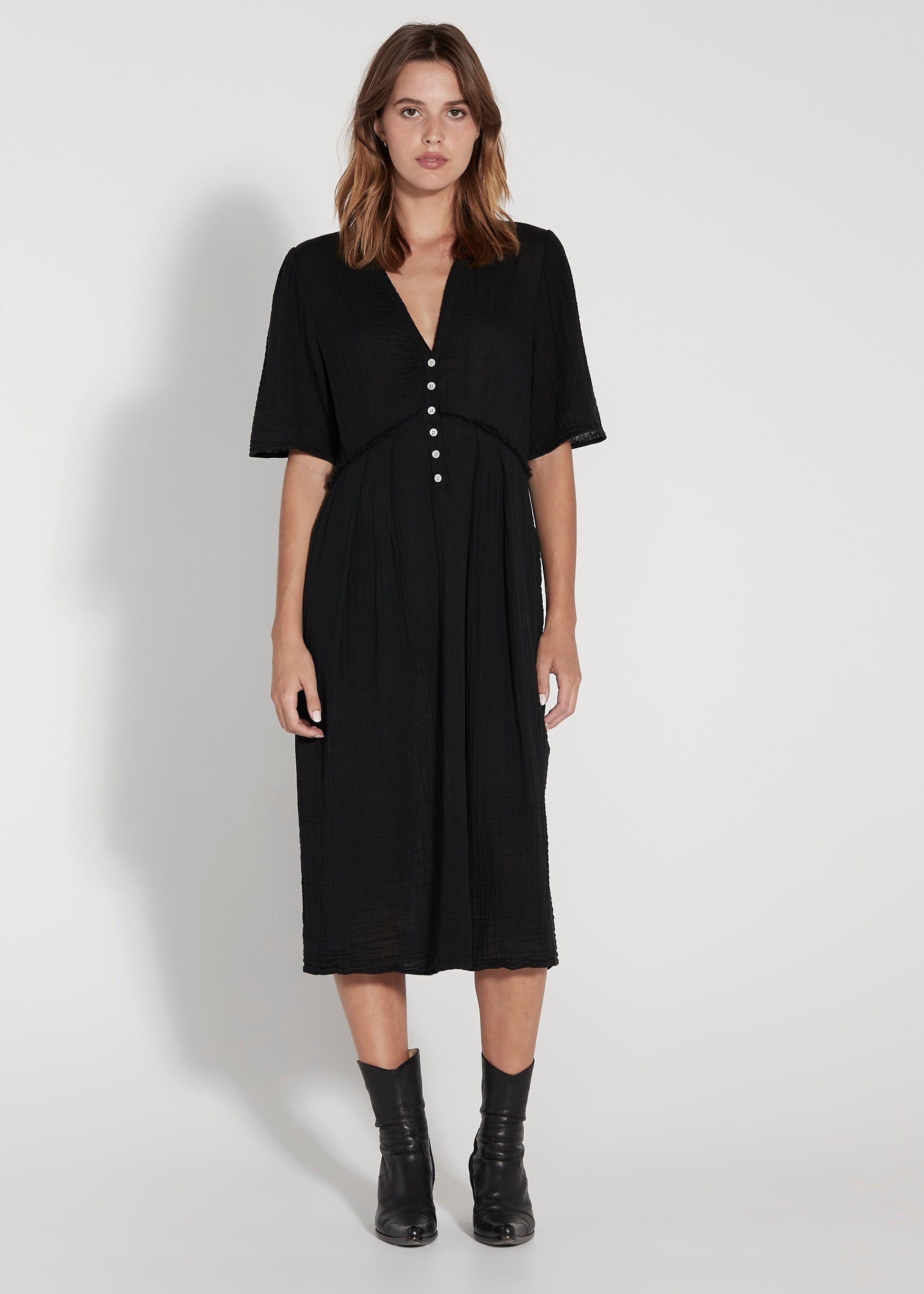 Light and airy cotton gauze dress featuring a deep v-neck, button detail top, and a loose skirt. Designed with an exposed raw edge seam around the waist
