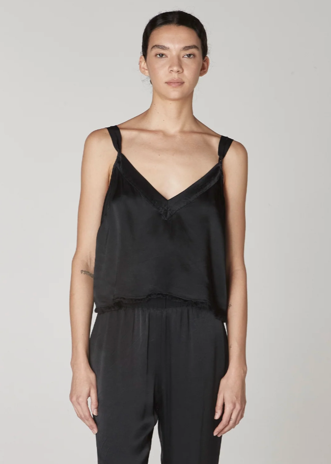 Designed with a fluid fit, featuring a deep v-neck and adjustable strap details.