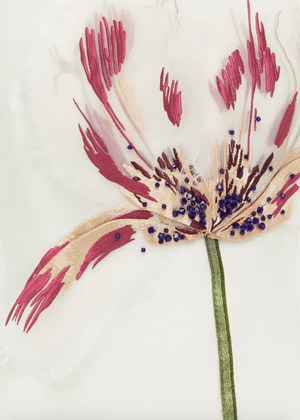Crafted from a luxurious wool-silk blend, this midi-length dress features delicate spaghetti straps, a square high neckline, and a flattering fitted bodice. The A-line skirt flows gracefully, adorned with an intricate floral embellishment that catch the light with every step. Fully lined and finished with an invisible back zip, it's a refined yet modern choice for any soireé.
