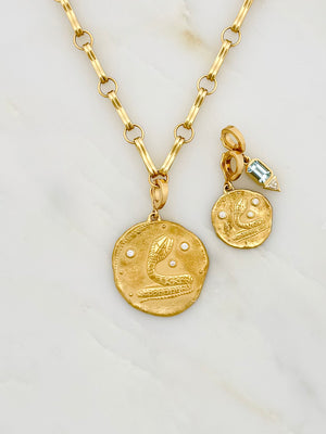 Depicting a serpent. This is a powerful symbol of transformation and metamorphosis, often linked to growth, healing, and renewal. Because snakes shed their skin, they represent the ability to let go of the old self and emerge renewed. This coin comes on a charm clasp. Meaning the clasp opens and closes and can be taken off or put on any chain.