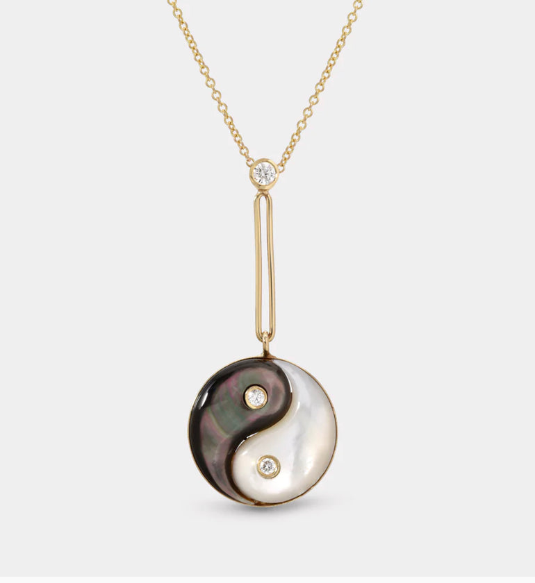 This pendant features hand cut natural Mother of Pearl with white diamonds set in 14k yellow gold.