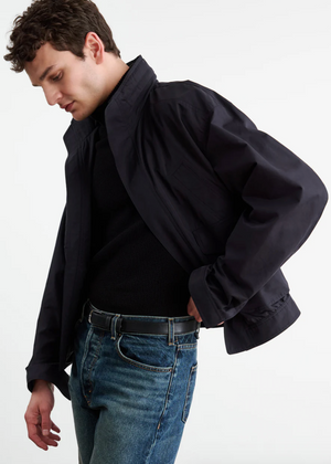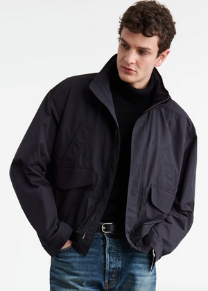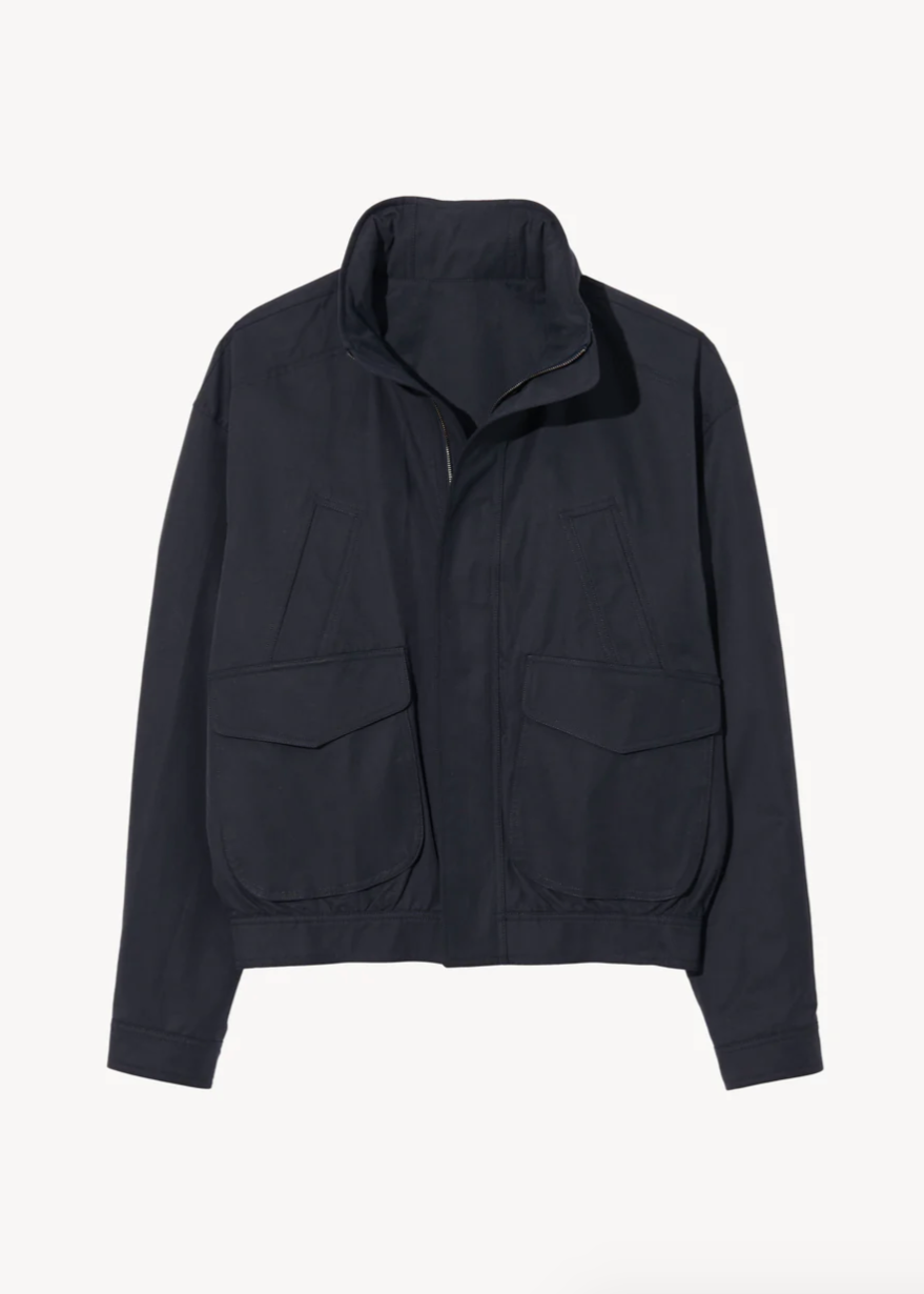 Relaxed bomber jacket in water resistant cotton nylon blend. Hidden snap closure. Zip front. Patch pockets. Chest slant pockets. Snaps at cuffs. Cinched waist. Interior chest pocket. Hidden zipper at collar with hood. Fully lined.