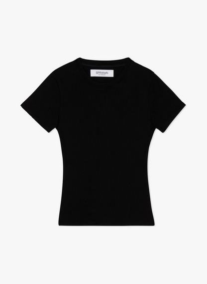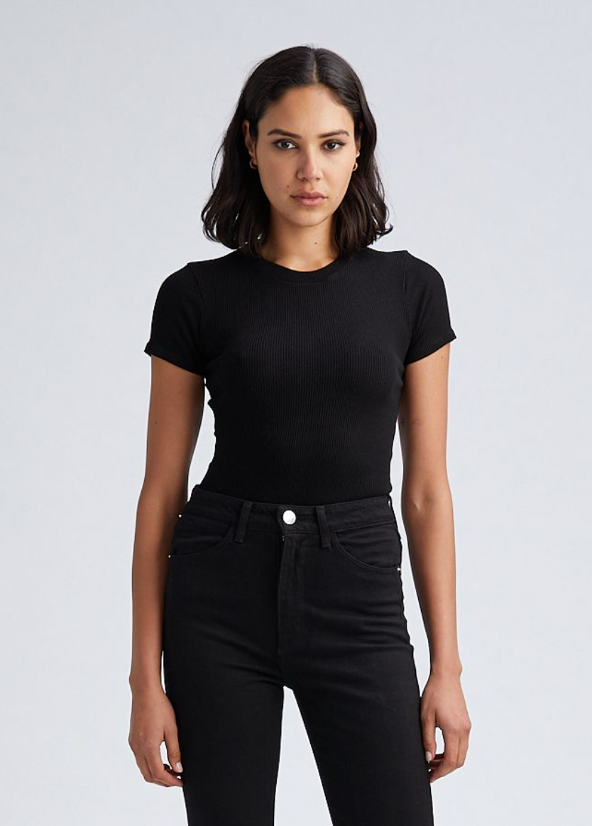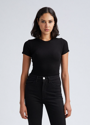 The perfect classic short sleeved crewneck t-shirt made in a breathable, ultra-stretchy, rib knit fabric that is wearable in any climate. Small horizontal ridges help to create a slimming and figure-hugging silhouette with a slightly tighter fit. Tuck it into your favorite jeans or wear it under thick leather layers.