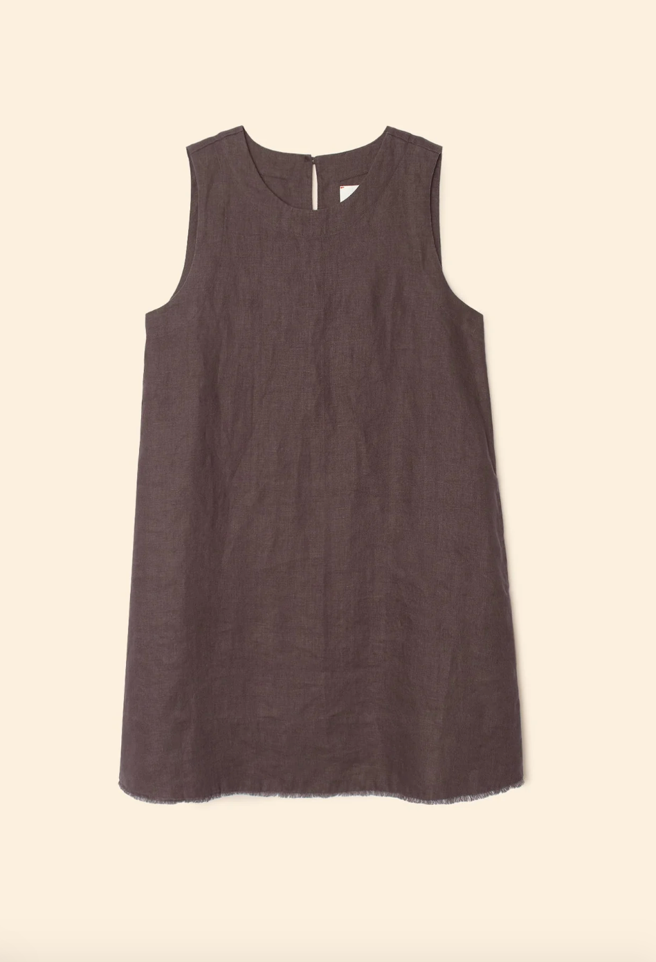 This sleeveless shift dress is designed from 100% lightweight linen. A classic design featuring a round neck, raw edge hem, side seam pockets, and a keyhole button-back.