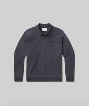 An elevated rework of the classic rugby shirt, this long-sleeve polo is crafted from midweight French terry cotton with a bit of stretch for comfort and movement. The dark charcoal color feels both muted and modern, complemented by a minimal front pocket and softly structured collar. Designed to layer under jackets or wear alone, it delivers casual ease with a refined edge.