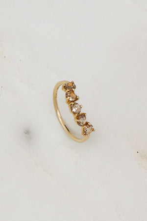 Featuring five rose cut champagne diamonds in prong settings, designed to allow each facet to catch the light at every angle. This curved diamond band will complete any ring stack, and the generous curve leaves plenty of room to stack with all different shapes.
