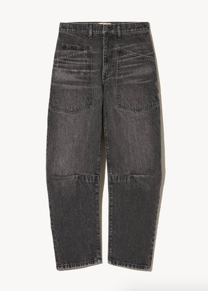 Mid-rise, relaxed fit barrel leg jean. Uniquely curved silhouette. Seam detail at knees. Gusset at inseam. Zip fly. Shank closure. Top-stitched front and back patch pockets. Belt loops.