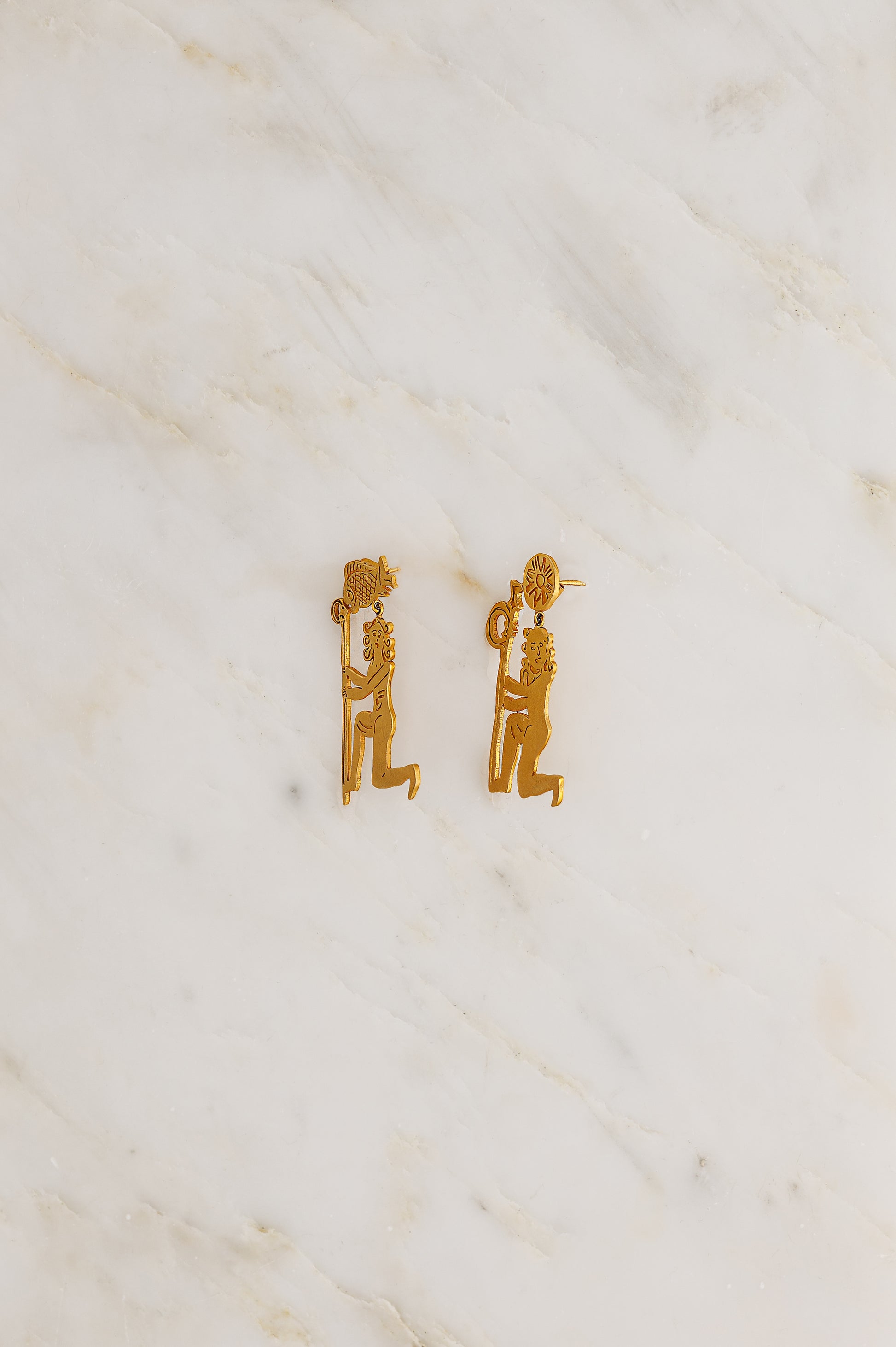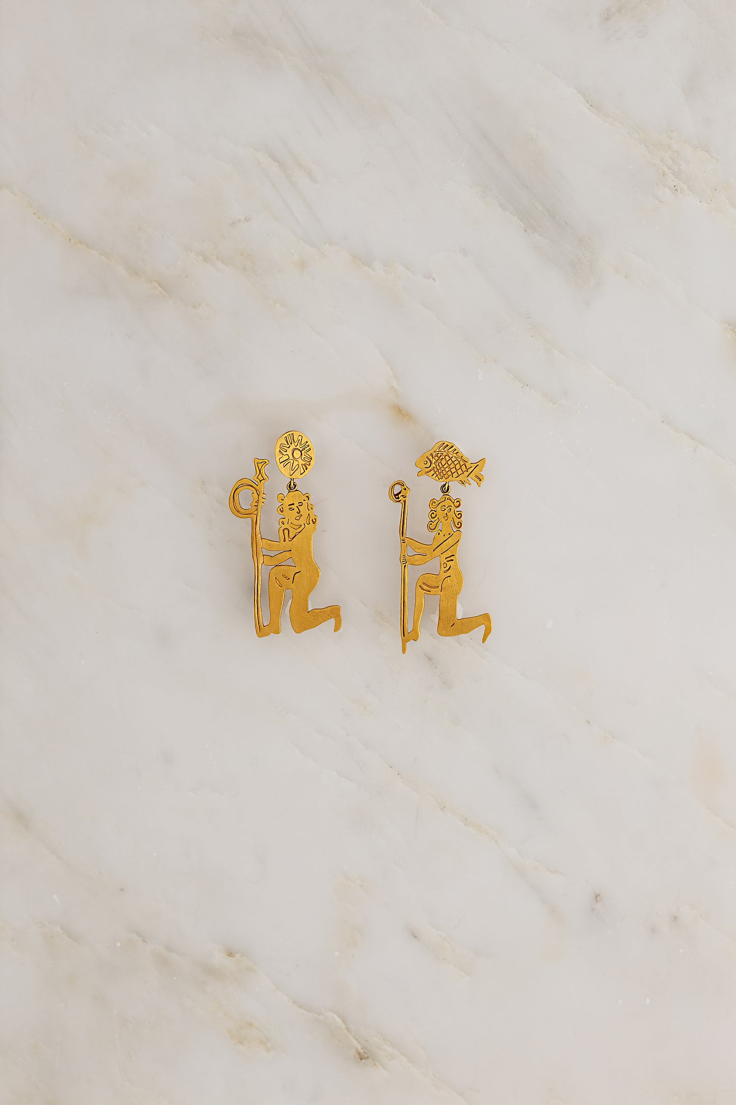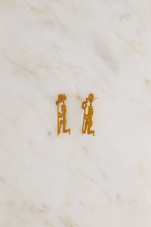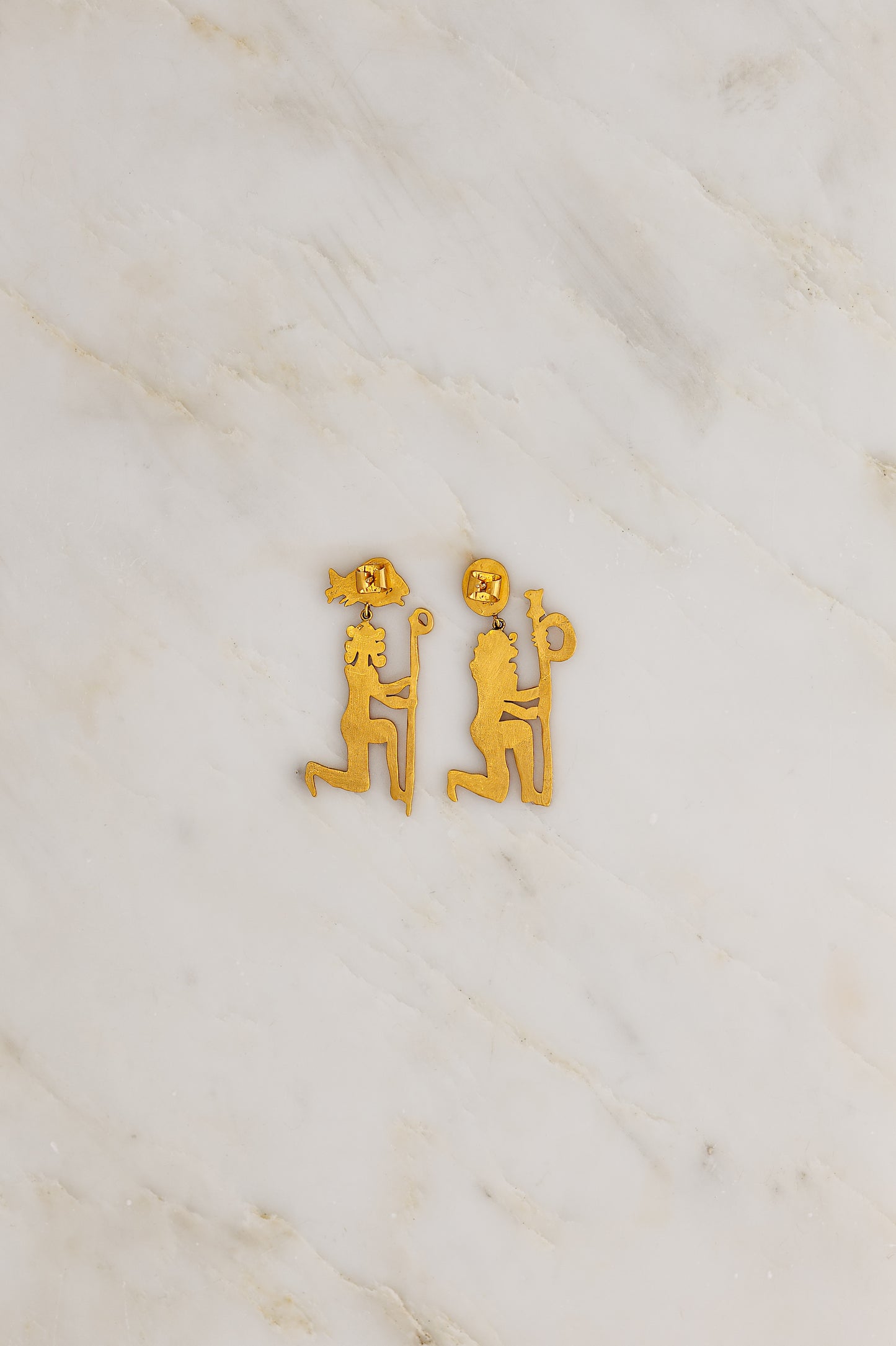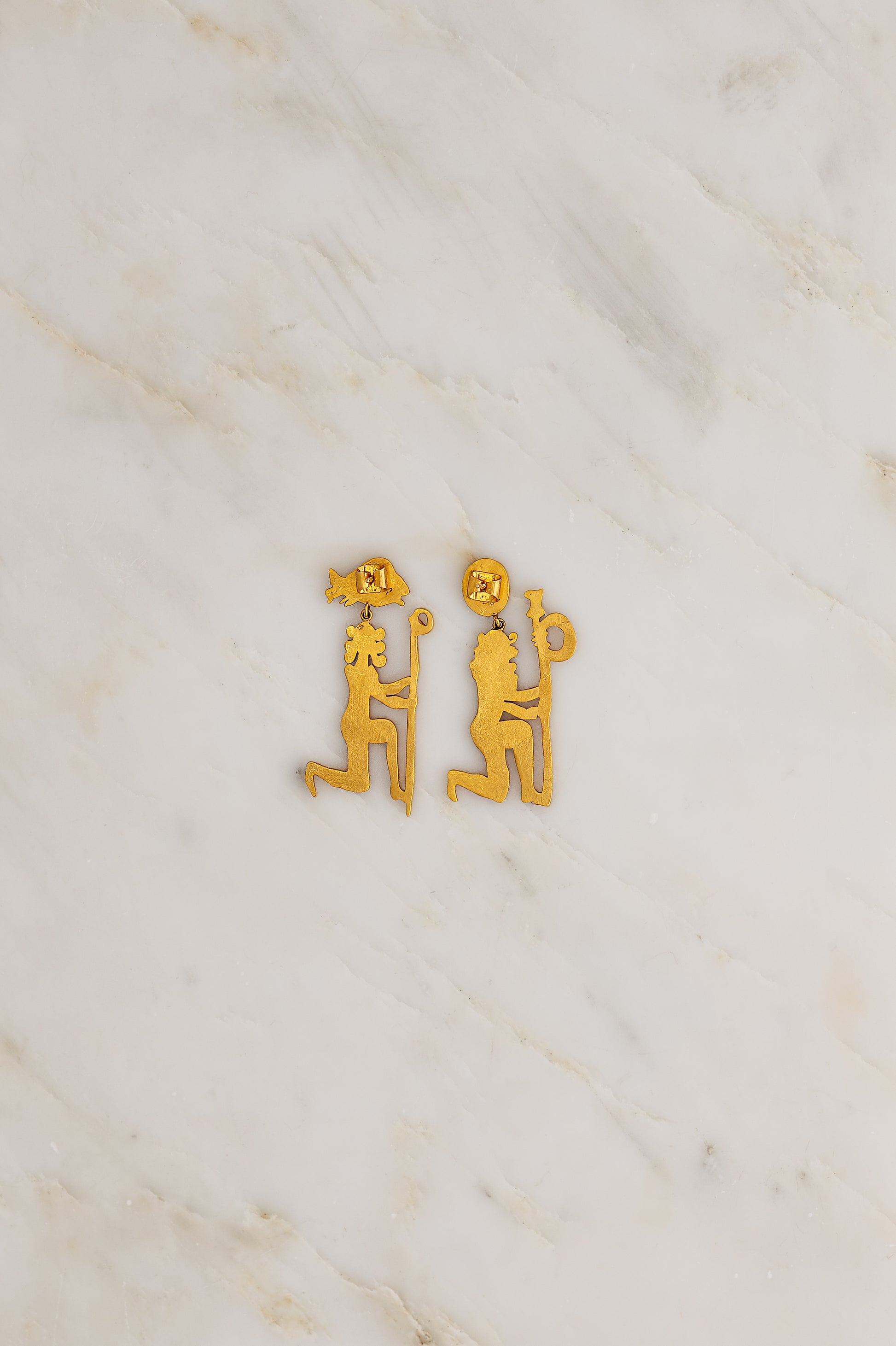 Hand carved Sisters Ear Pendants featuring ancient Egyptian imagery in 18K Fairmined Yellow Gold.
