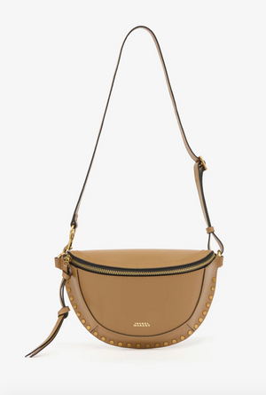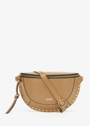 Belt bag in calfskin leather adorned with metal studs, featuring adjustable shoulder strap with buckles.