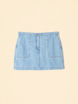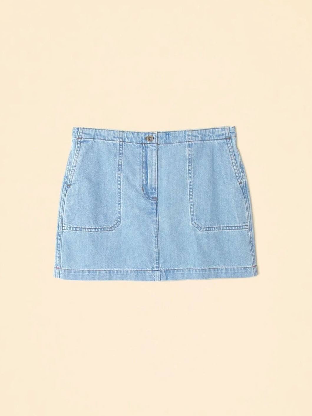 Made from midweight recycled blend denim, this mini skirt has a button closure, zipper fly, and front and back patch pockets.