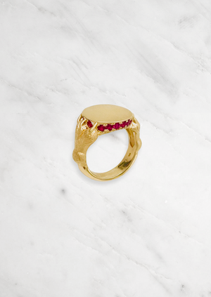 A powerful modern heirloom, the Claw in the Love Signet Ring captures Circa 1700’s signature tension between romance and rebellion. Handcrafted in rich 18k gold, its design features two delicately curved claws embracing a halo of vibrant pink rubies - a symbol of protection, devotion, and permanence. Each ring is meticulously carved and finished by hand, honoring the house’s dedication to old-world craftsmanship with a contemporary edge. Made to be worn daily, loved fiercely, and passed down with meaning.