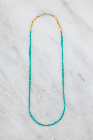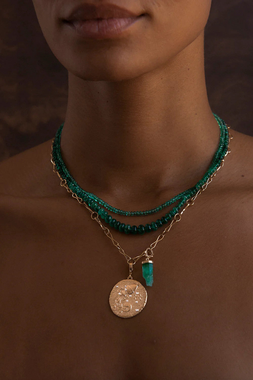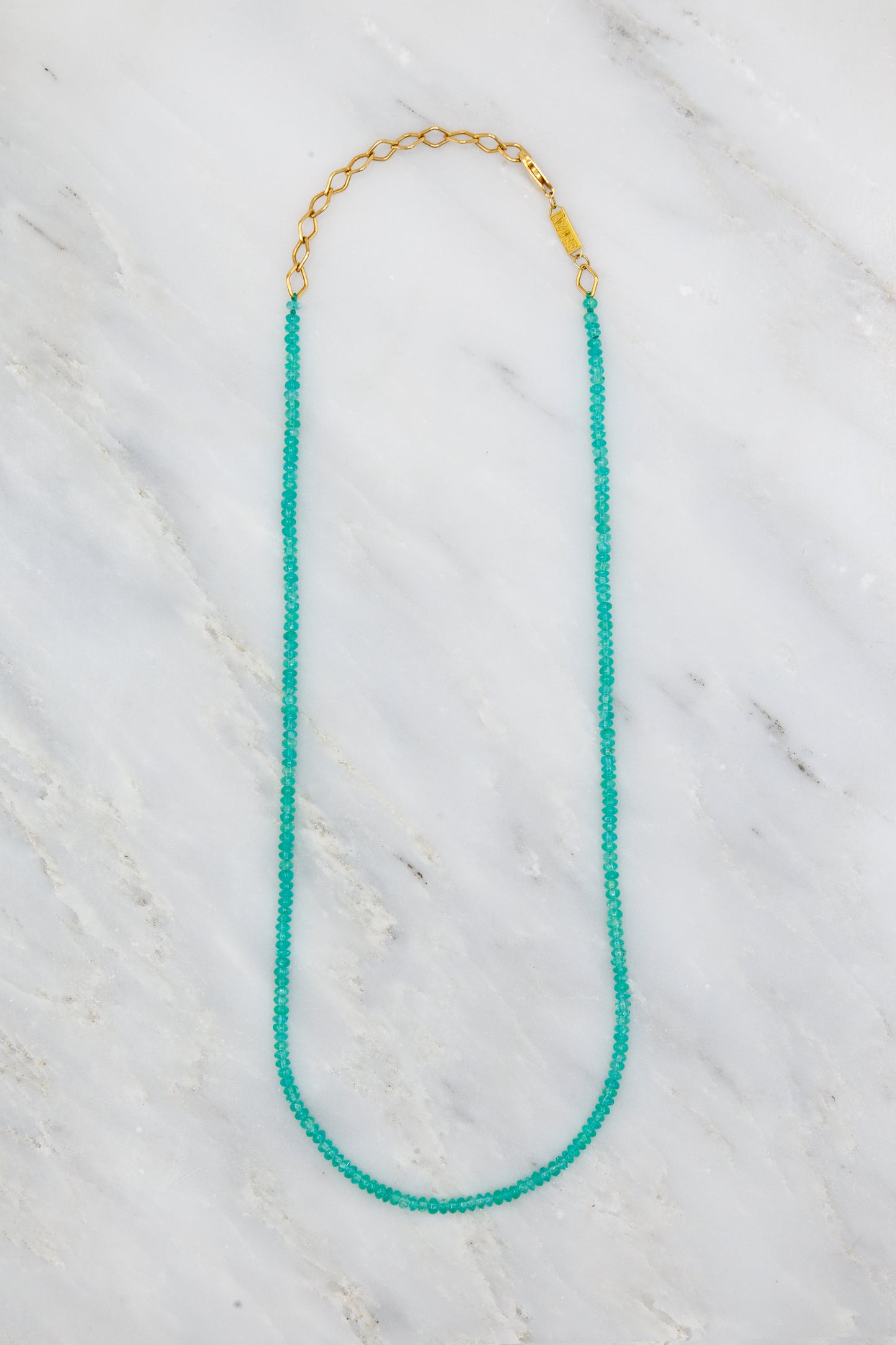 Made and hand-finished in Los Angeles, this necklace features a delicate strand of light green Zambian emerald beads, each thoughtfully selected for its vibrant hue and unique character. The smooth, polished surface of the beads reflects light beautifully, creating a subtle yet captivating sparkle. An 18k yellow gold chain extender at the back allows for 2" of adjustable length. Please note: these necklaces are not meant to be worn in water. Please remove before swimming or showering.