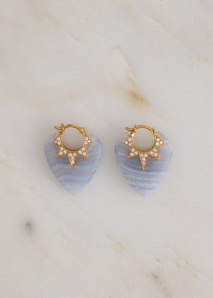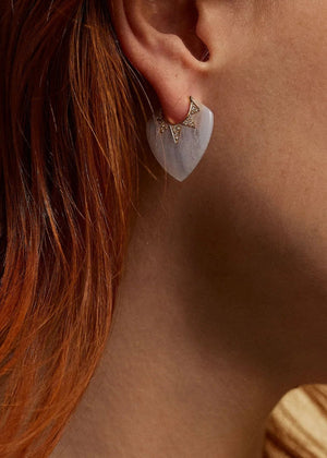 Awaken your inner rockstar with these handcrafted 18k yellow gold earring in a guitar pick shape with carved blue lace agate and diamonds.