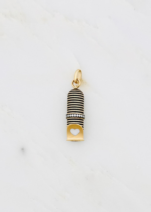 A whimsical talisman that is both beautiful and functional - yup, it works! Crafted in 18k yellow gold and accented with enamel stripes and oxidized modern brilliant cut diamonds. When worn, the whistle spins around to reveal a tiny white enamel heart at the base.