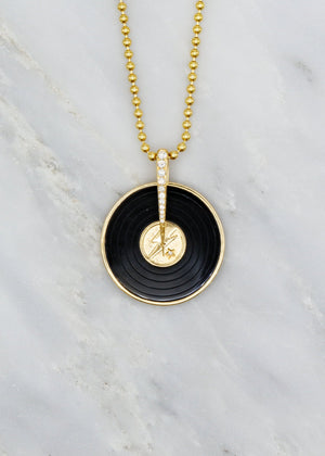 Designed to resemble a vintage record, Sorellina's Spinning Record Pendant features intricate details that bring the concept to life. Crafted from 18k yellow gold with diamonds and black onyx, featuring a unique spinning design that allows the record to rotate effortlessly, this is the perfect accessory for any music lover or off-duty rock star.