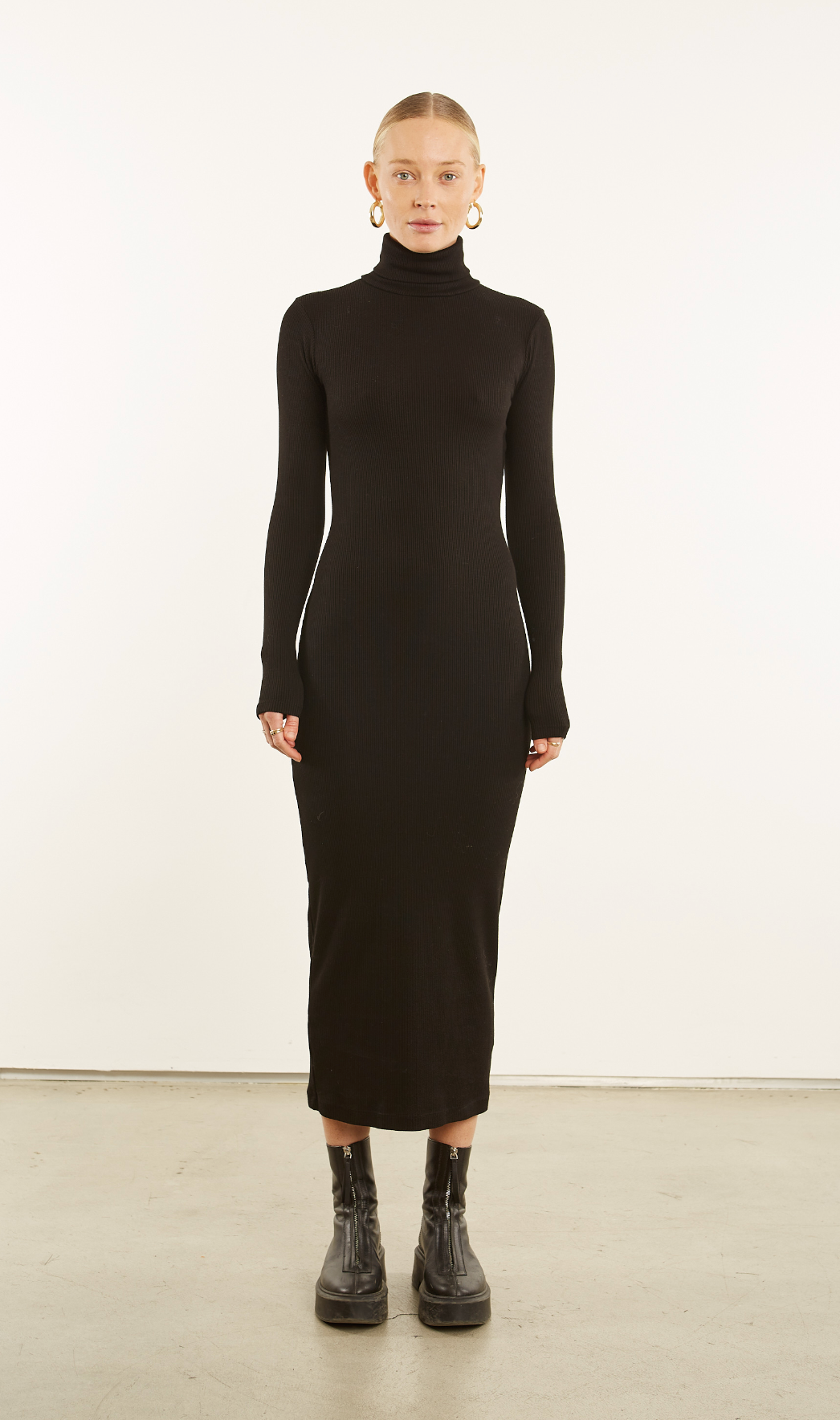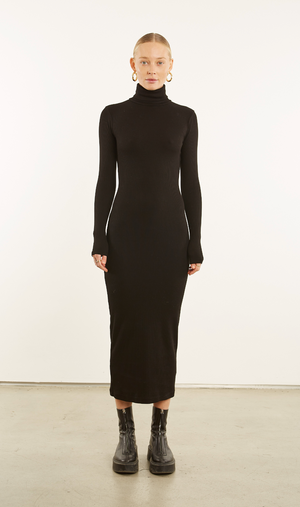 A cozy turtleneck dress with a breathable feel and forgiving drape, featuring long sleeves and a hemline that falls just below the calf.