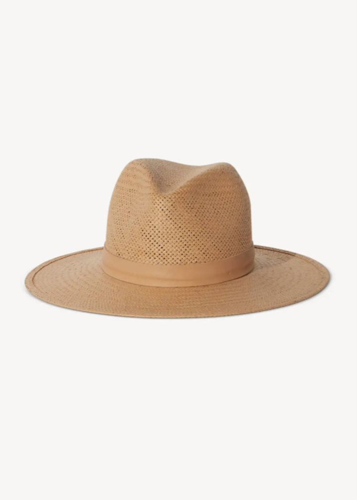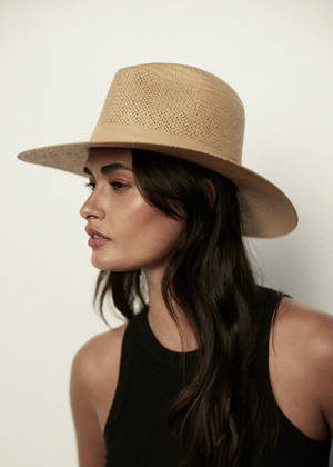 Simone is a classic style fedora made with packable straw and a structured modern shape. Rich black or sand straw with a tonal leather band creates a minimal and timeless look. This hat was made to accompany you to the beach, under the sun, to dinner, and anywhere you travel in between.