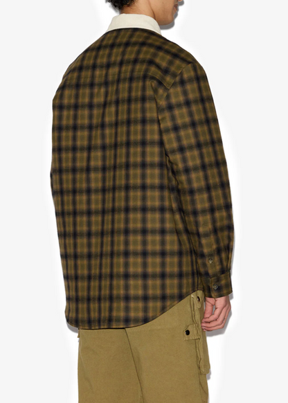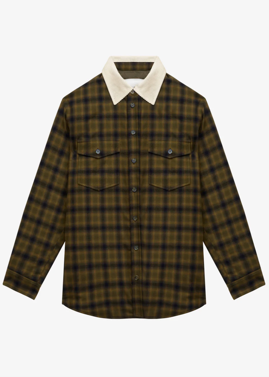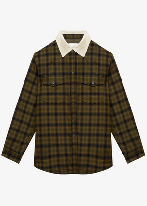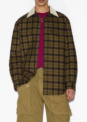 Long sleeve checkered cotton overshirt jacket with contrasting corduroy shirt collar and patch pockets with buttoned flaps.