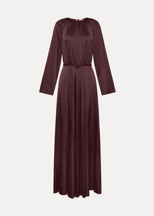 Draped in luxury, this gown swathes the body in fluid stretch satin, with raglan sleeves for ease and gathered neckline detailing that adds soft movement. A knotted belt defines the waist, while its weighty drape feels both elegant and effortless.