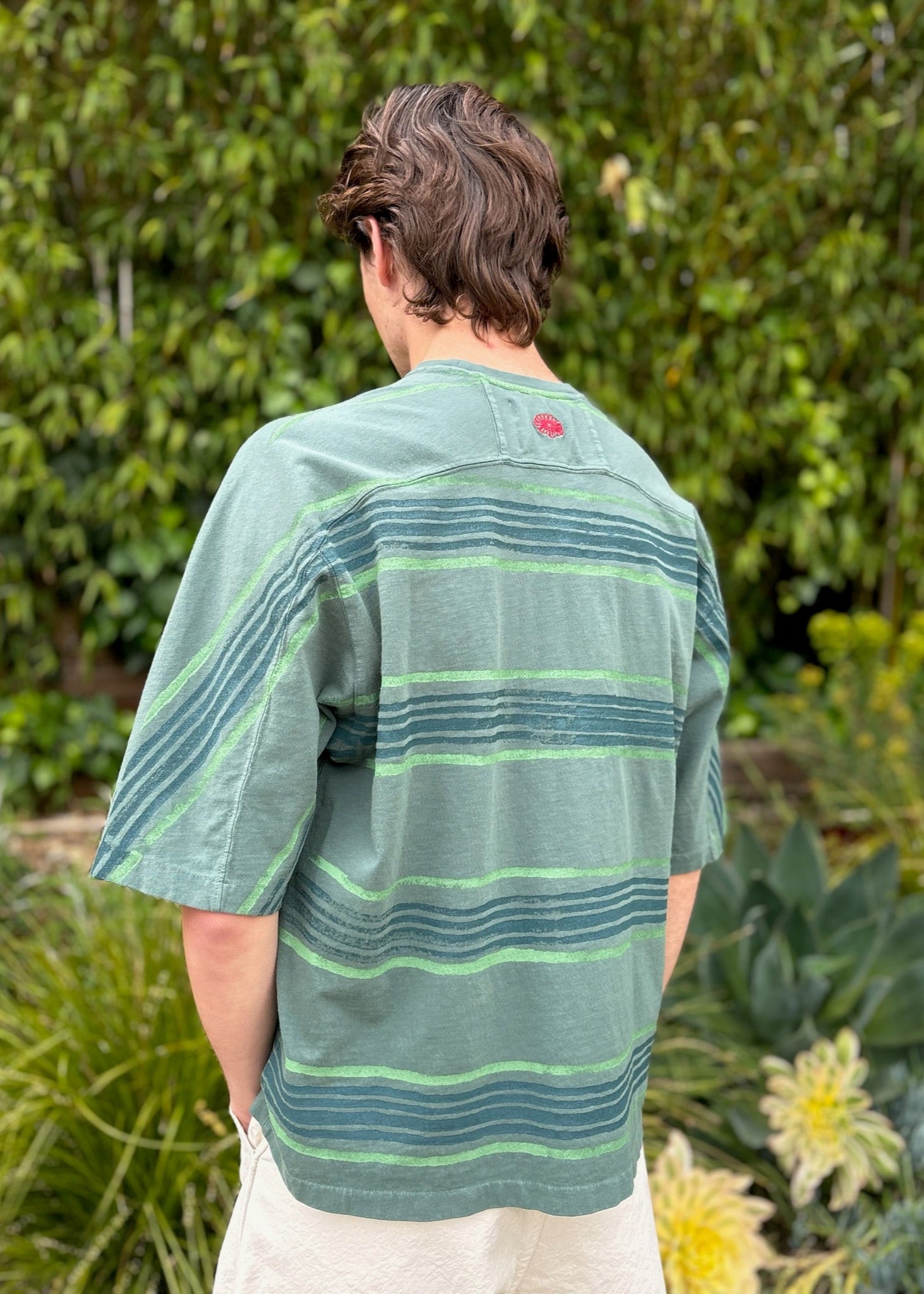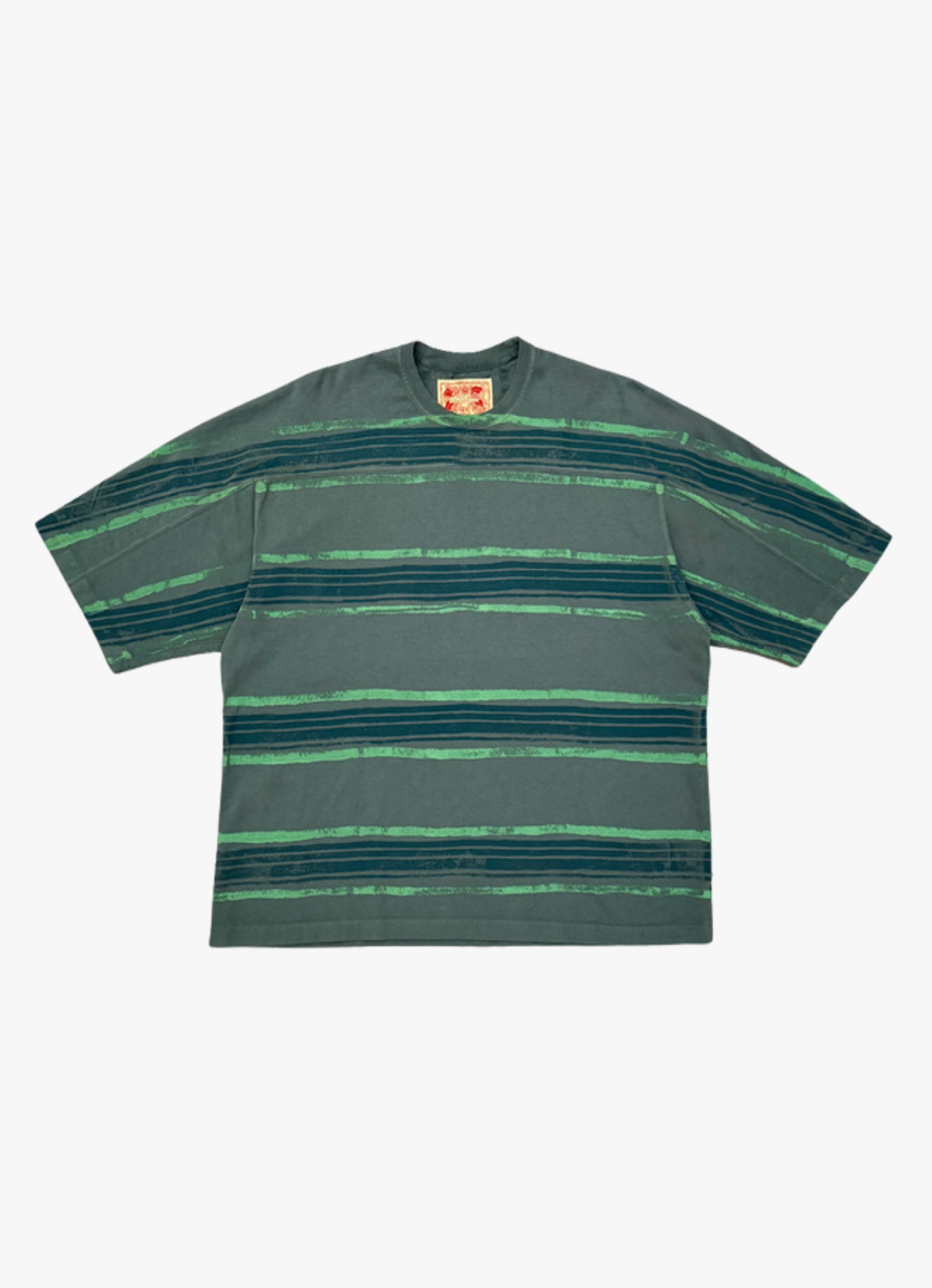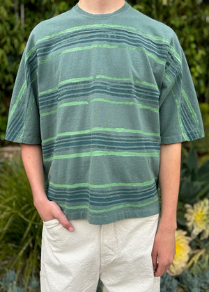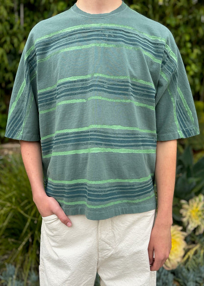 Boxy fit tee with wide body and slightly cropped length. The sleeve length extends just below the elbow. Chest seam runs across the chest and down the sleeve to mirror your favorite vintage 70's football shirt.