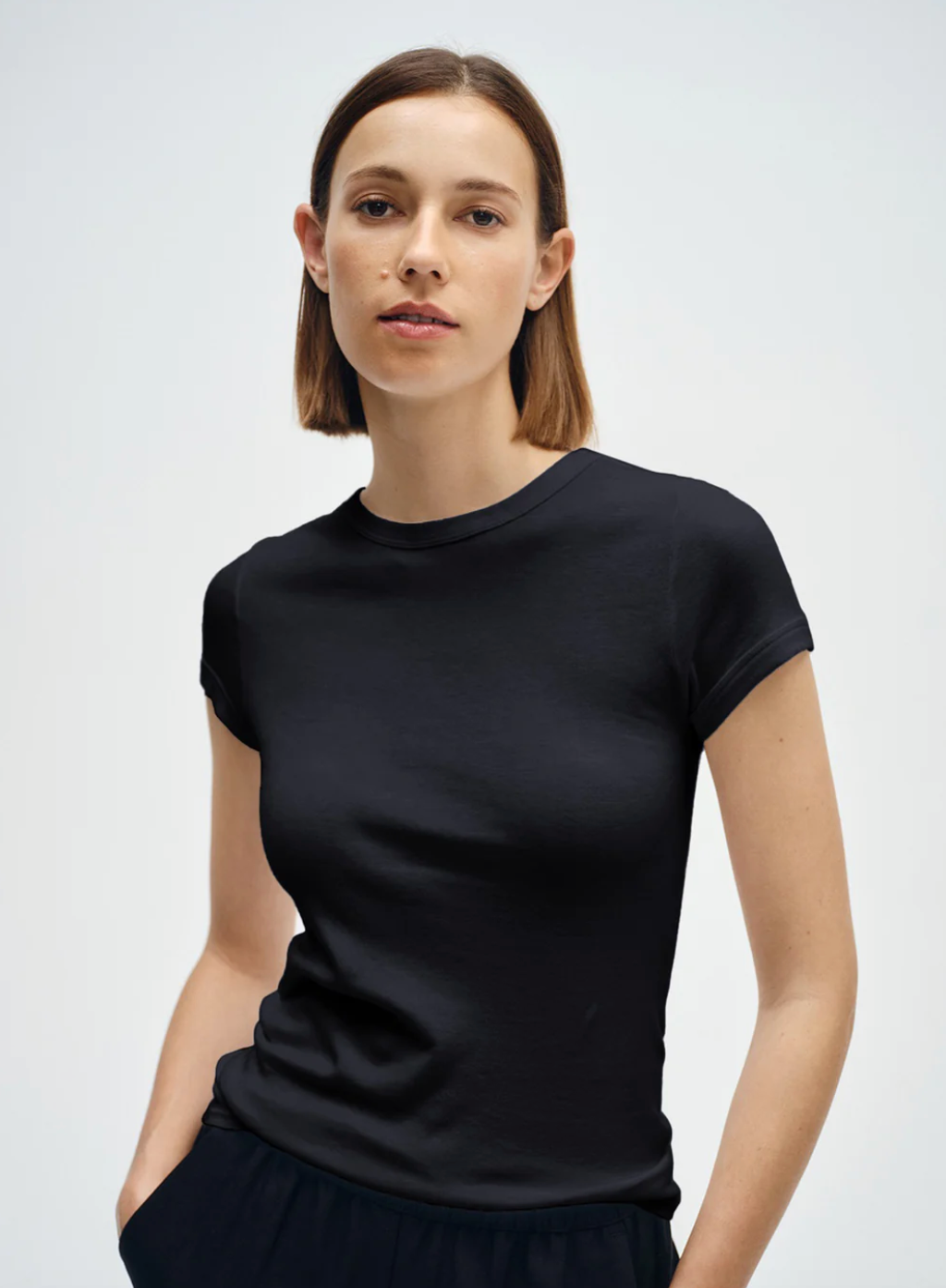 Crafted from 100% Supima cotton for an ultra soft hand, the Cap Sleeve Crew is designed with a slim fit, classic crew neckline framed by cap sleeves.