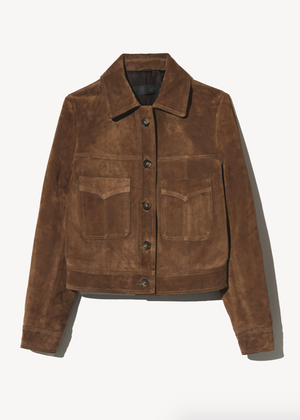 Slim boxy fit cropped jacket. Double needle topstitching. Functional center front closure. Western-inspired details with clean sleeves and seam accents. Logo buttons. Fully lined.