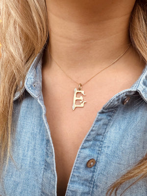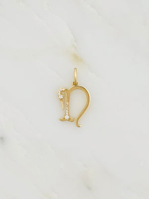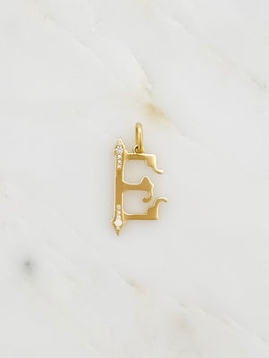 Yellow gold initial charm featuring a scattering of white diamonds.
