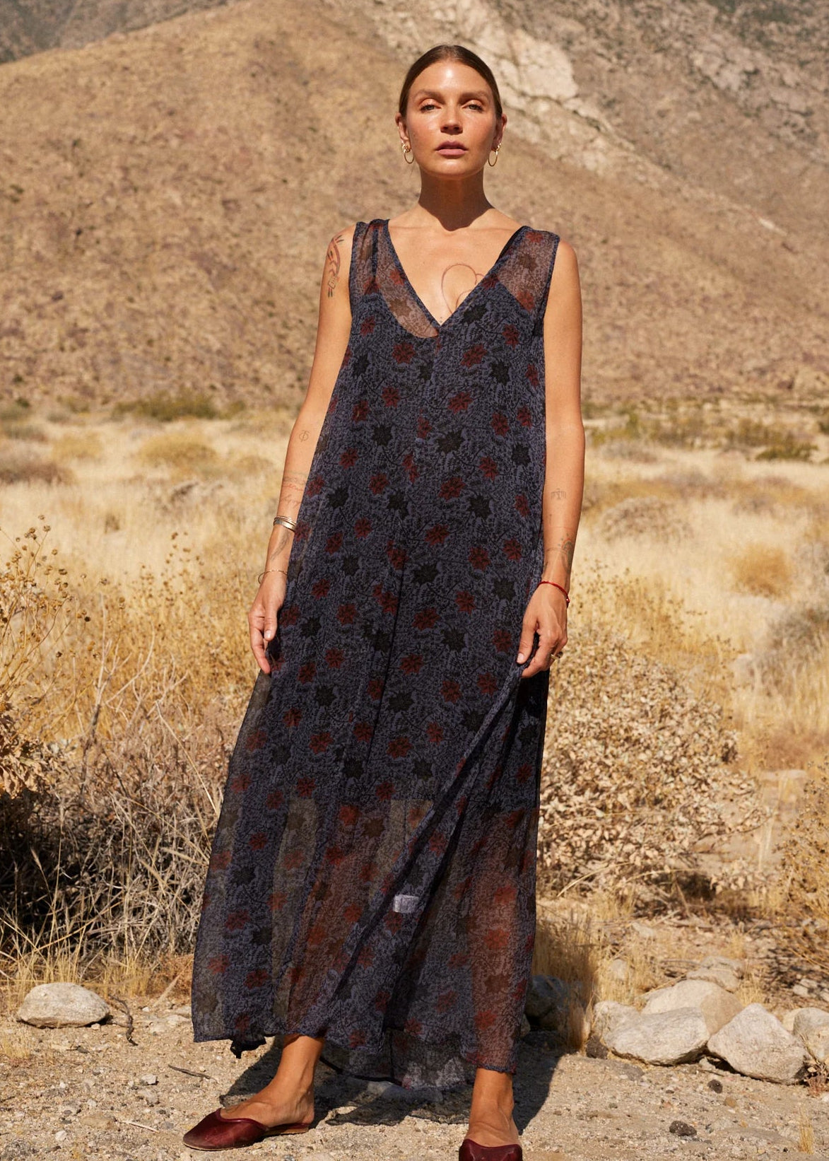 Sleeveless maxi dress with pockets, thick straps and v-neckline. Featuring pleating at the back of neck.