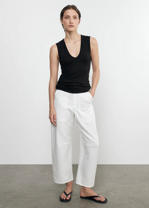 Crafted from Tencel linen twill, the Twill Work Pant features a barrel-shaped silhouette with a slight taper at the legs, knee seam details, and front patch pockets.