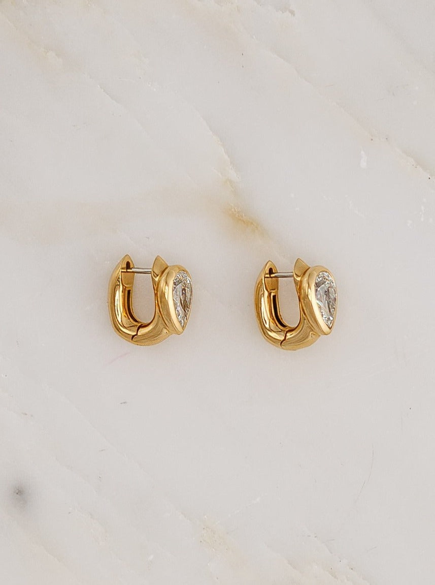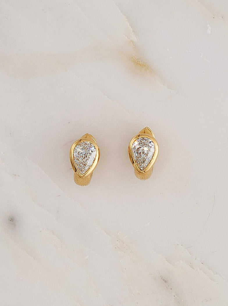 Crafted from polished 18k yellow gold, these wide huggies are adorned with sparkling pear shape white diamonds.