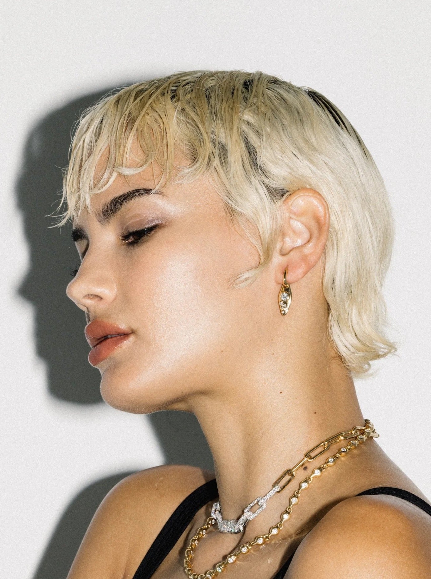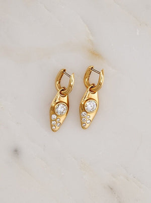 These 'Vessel' huggies are handmade in NYC from 18k yellow gold, featuring sculptural drops inlaid with glistening diamonds.