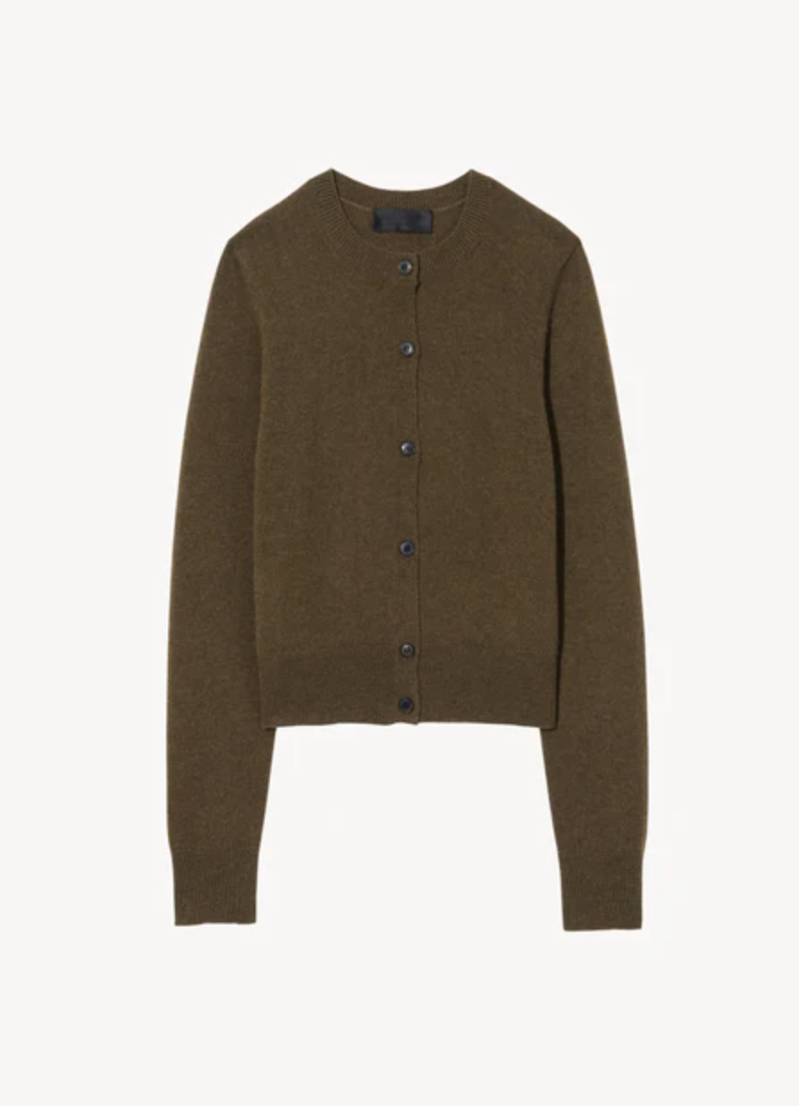 Light to medium weight cardigan. Six button center front closure. Fully fashioned along neck, sleeve and arm hole. Center back signature cable knit detail.