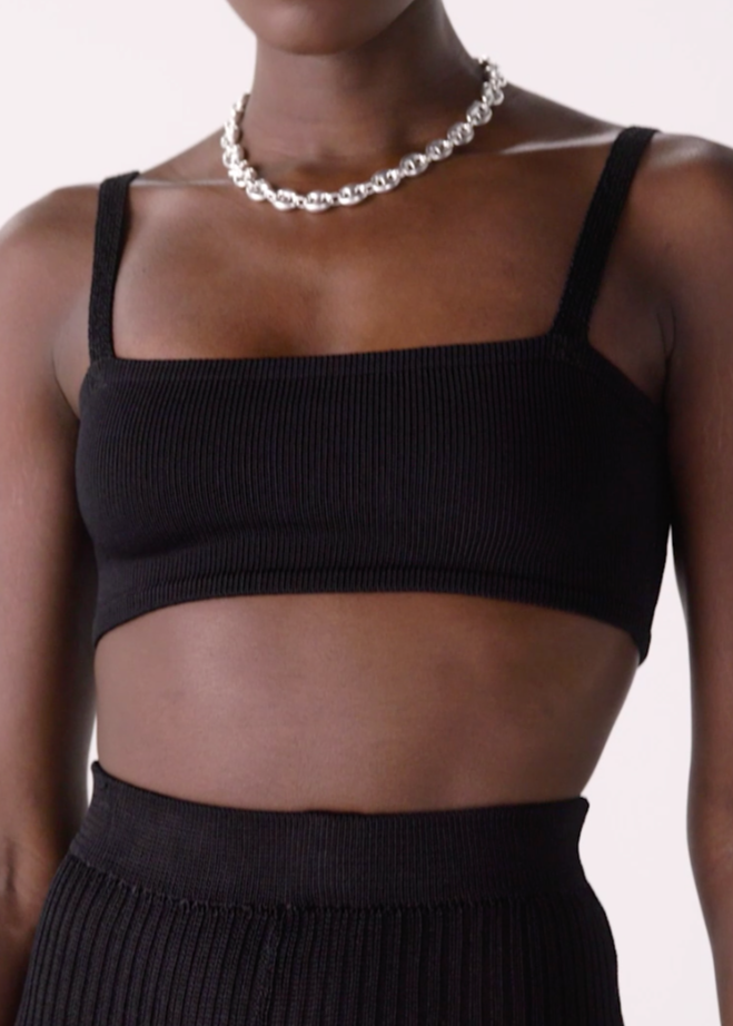 Designed with a soft-yet-supportive fit, featuring a chic square neckline. Knit in Calle del Mar's shiny signature viscose-lycra blend yarn, this bralette style is perfect for layering year round.