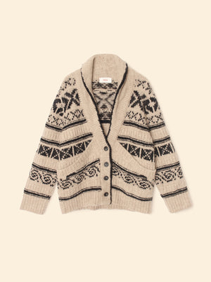 Vail is new this season in Xirena's superfine alpaca blend. This fair isle cardigan sweater features a ribbed shawl collar, cuffs, hem, and patch pockets.