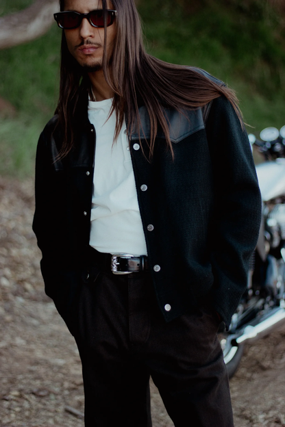 Boucle wool and black leather jacket, finished with HFR signature hardware.