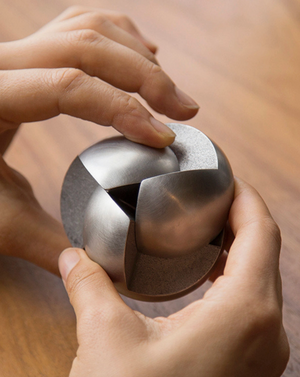 Three identical pieces form a perfect, heavy metal sphere – it's easy to take apart, yet surprisingly difficult to put back together. The Venn Puzzle is a beautiful dexterity challenge and an intriguing addition to your desk, shelf, or coffee table. It feels heavy and cool in the hand, with the pieces shifting in synchronized motion, similar to the aperture of a camera. Even after getting the hang of it, you're certain to reach for it again and again – it's an incredibly satisfying object to hold and appreciate.