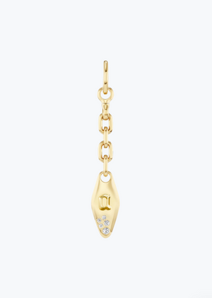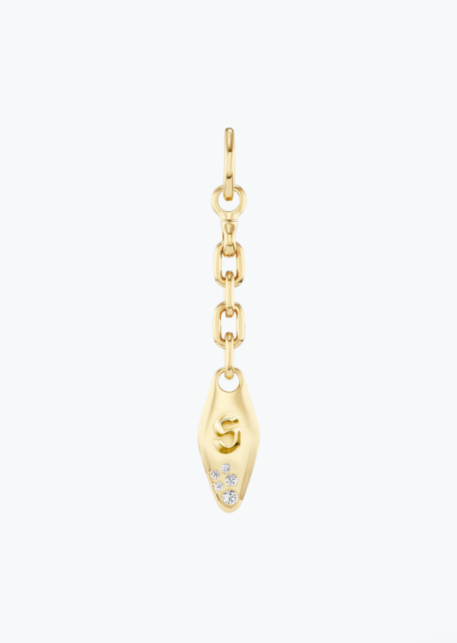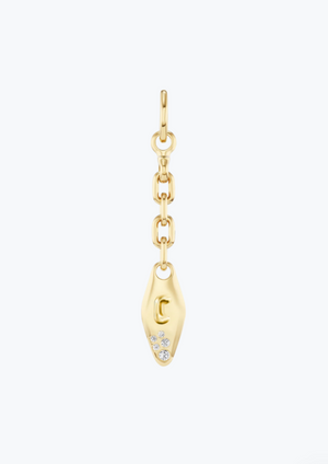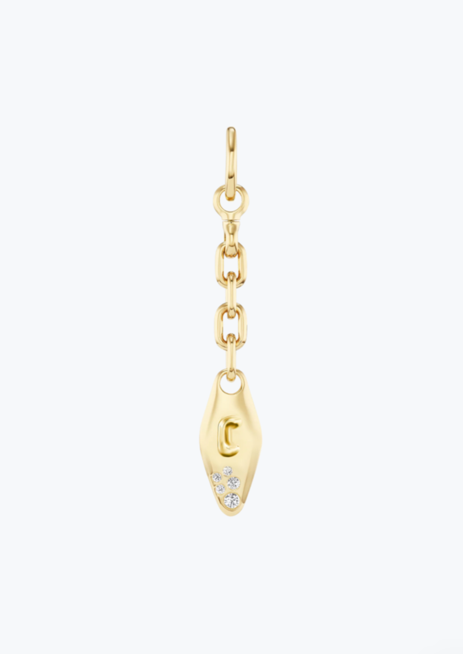 Elegant in its simplicity, theVessel Drop Letter Charm is a sculpted teardrop pendant cast in solid 18k yellow gold, accented with a cluster of round brilliant-cut diamonds. Each piece is handmade in New York City and designed to be personalized with a letter or numeral of your choice, transforming it into a subtle signature of identity. Designed to hang from the Uniform Object System Necklace, this charm features a 4-link swivel chain drop. Customization available with single letters (A-Z) or numbers (0-9).