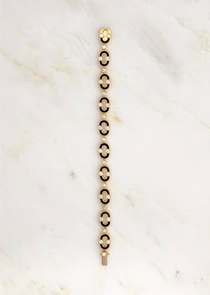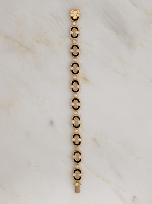 Crafted in 18k yellow gold, this bracelet features a chain link of striking black onyx inlays accented by white diamonds, as duality and attraction meet in sculptural form. Each piece of Viltier's Magnetic Collection is built around a bold, circular motif - two halves meeting in perfect balance - symbolizing the invisible pull between people, places, and moments that belong together.
