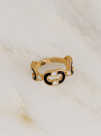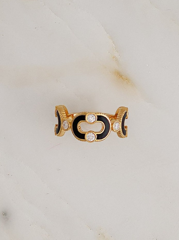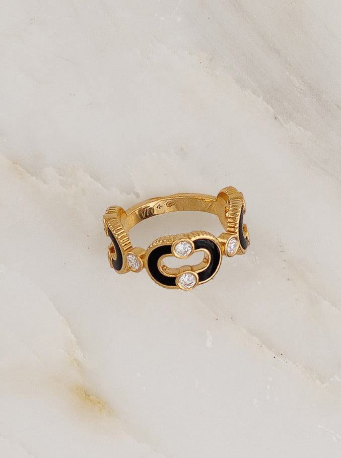 Crafted in 18k yellow gold, this ring features a chain link of striking black onyx inlays punctuated by white diamonds, as duality and attraction meet in sculptural form. Each piece of Viltier's Magnetic Collection is built around a bold, circular motif - two halves meeting in perfect balance - symbolizing the invisible pull between people, places, and moments that belong together.