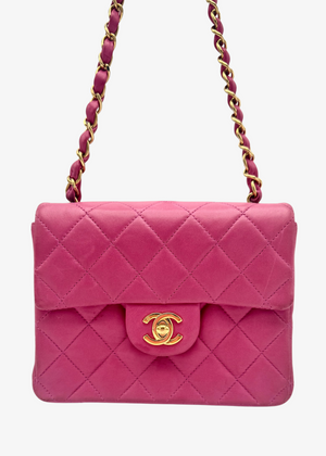 Vintage Chanel Lambskin Quilted Mini Square Flap Bag in Pink. Featuring CHANEL's iconic diamond quilted lambskin, gold chain link leather threaded shoulder strap, and gold-plated Chanel CC turn lock. The single flap interior is stitched with the double-C logo, and opens to a matching pink leather interior with zipper and patch pockets. Single back exterior pocket.
