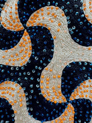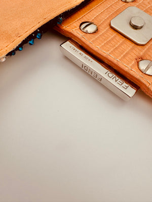 An icon of the late ‘90s and early 2000s, the Fendi Baguette is the original "It bag" and this beaded swirl edition is pure collector gold. Hand-embroidered with a hypnotic wave motif in navy, cream, orange, and metallic accents, it’s finished with genuine lizard trim and the signature FF buckle in polished silver-tone hardware. The compact silhouette and single shoulder strap capture the effortless glamour that made the Baguette a fashion legend, while the artisanal beadwork and exotic skin details make this one a rare, covetable find.